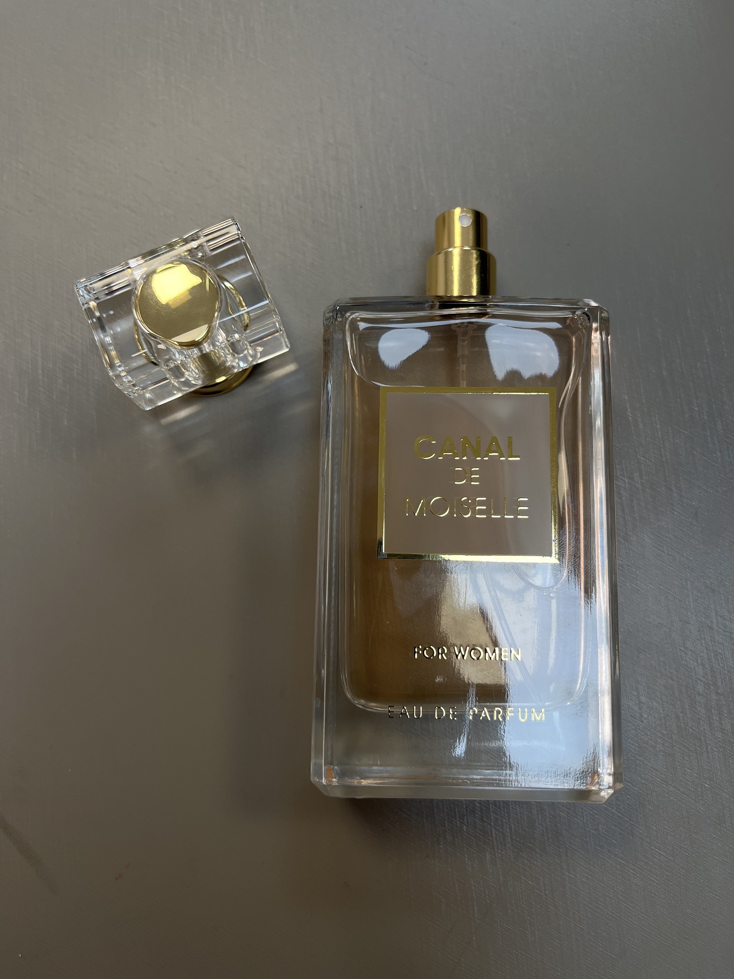 بطری مستطیل شکل، شفاف و صورتی رنگ ب همراه نوشته طلایی نشان دهنده ی ترکیب لطافت زنانه و شفافیت وجودی زنانه می باشد. روی شیشه یک کادر طلایی رنگ وجود دارد که درون آن نام Canal De Moiselle و در قسمت پایین نام Fragrance world دیده می شود. گردن بطری با رنگ طلایی خود، حال و هوای لوکس و شیکی به عطر بخشیده است. ظاهر و بسته بندی شیک ادکلن کانال دی مویسل بر گرفته از شیشه نمونه فرانسوی این ادکن یعنی کوکو مادمازل بهترین و محبوب ترین ادکلن زنانه جهان می باشد.